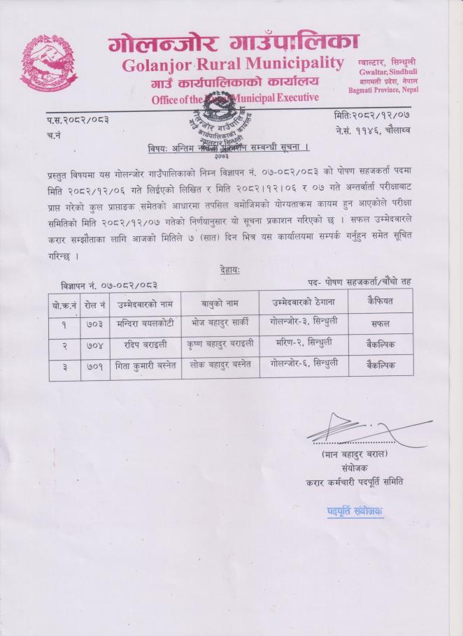अन्तिम नतिजा प्रकाशन सम्बन्धी सूचना।
