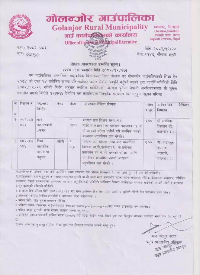 शिक्षक आवश्यकता सम्बन्धी सूचना।