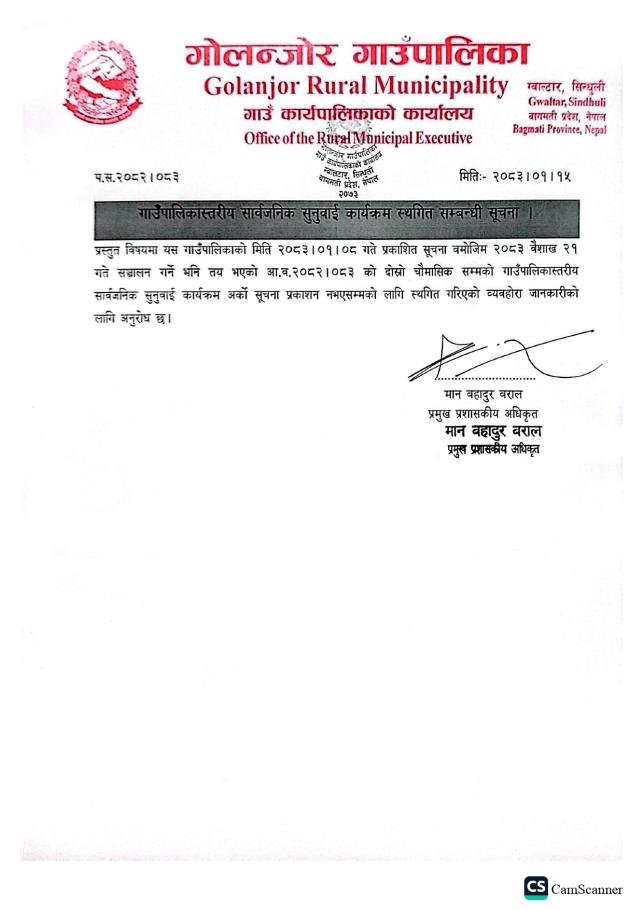 गाउँपालिकास्तरीय सार्वजनिक सुनुवाई कार्यक्रम स्थगित सम्बन्धी सूचना