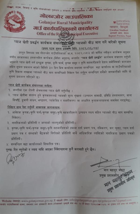 » प्याज खेती प्रवर्द्धन कार्यक्रम संचालनको लागि प्याजको बीउ माग गर्ने बारेको सूचना ।