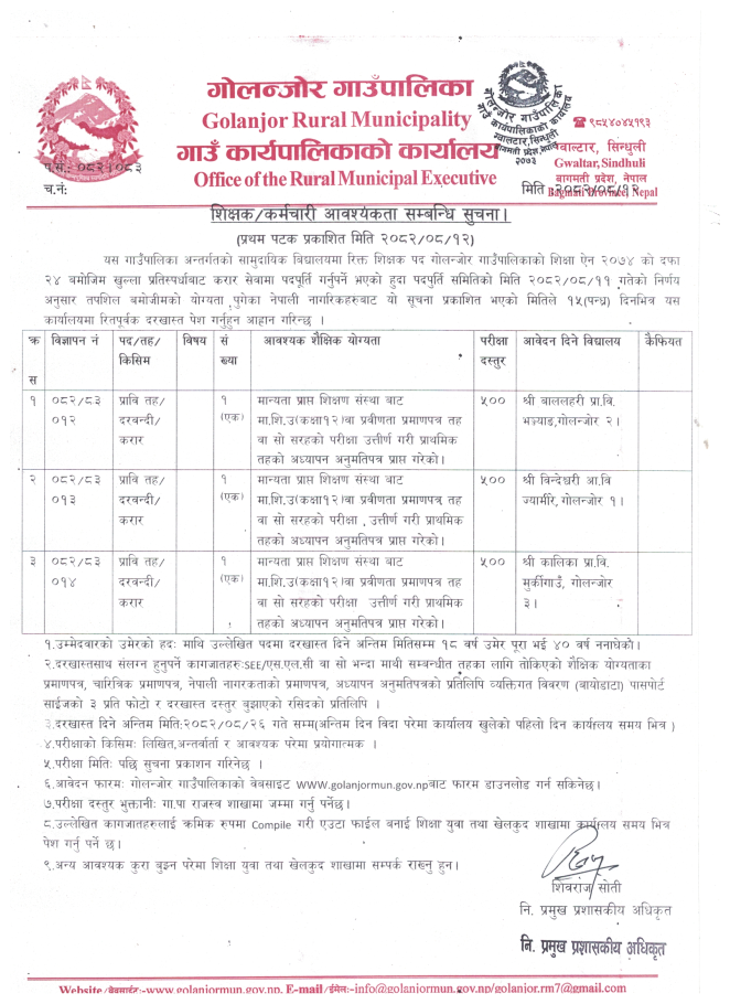 शिक्षक आवश्यकता सम्बन्धी सूचना